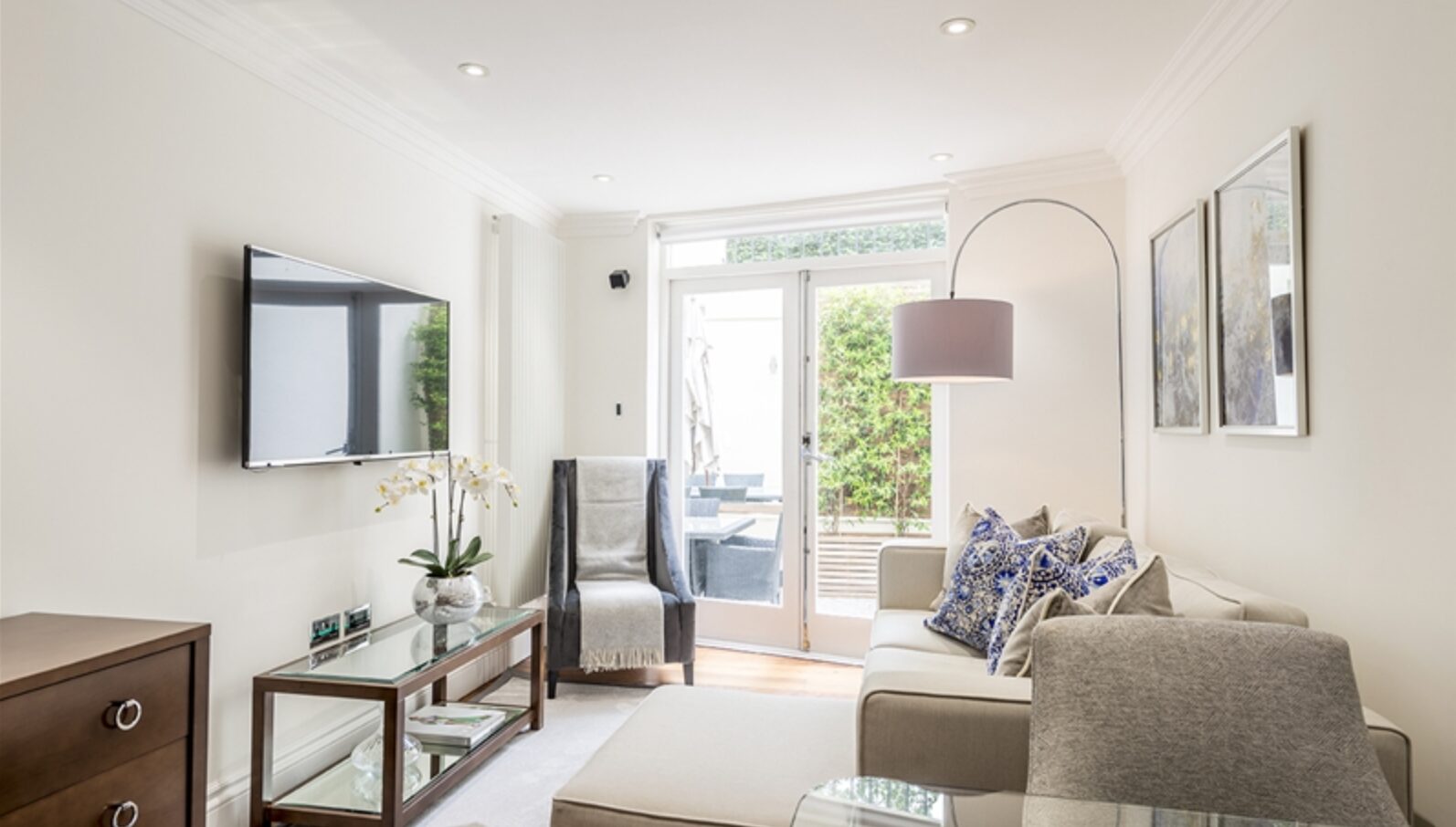 This beautifully renovated one bedroom, two bathroom apartment with a patio (389 sq ft) is located within a magnificent Grade II listed building. The apartment has been meticulously designed and furnished to the highest standards, blending modern finishes with the original features of the building. It boasts spacious bedrooms with custom built-in wardrobes, one of which has an en-suite bathroom. The luxurious reception room is adorned with bespoke furniture and leads out to a private patio. The apartment also features an exquisite polished marble bathroom and a fully equipped Miele kitchen. Residents have access to the stunning communal gardens, which are a rare find in London.