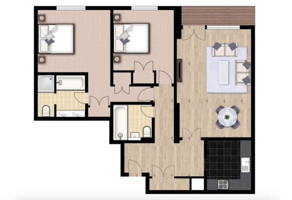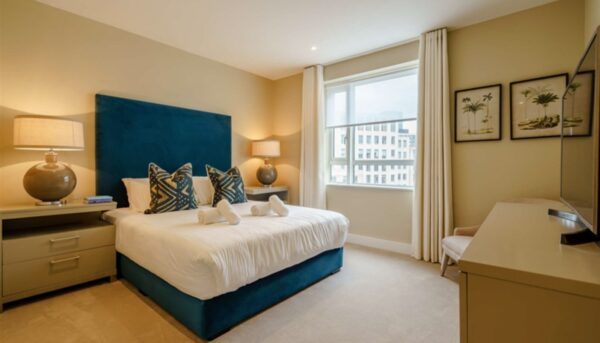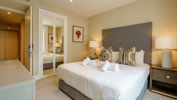 Both bedrooms are spacious and furnished with king size beds, bespoke fitted mirrored wardrobes, luxury carpet, and furnishings.