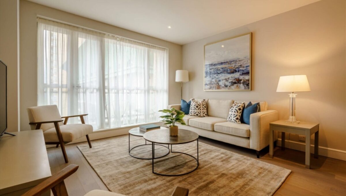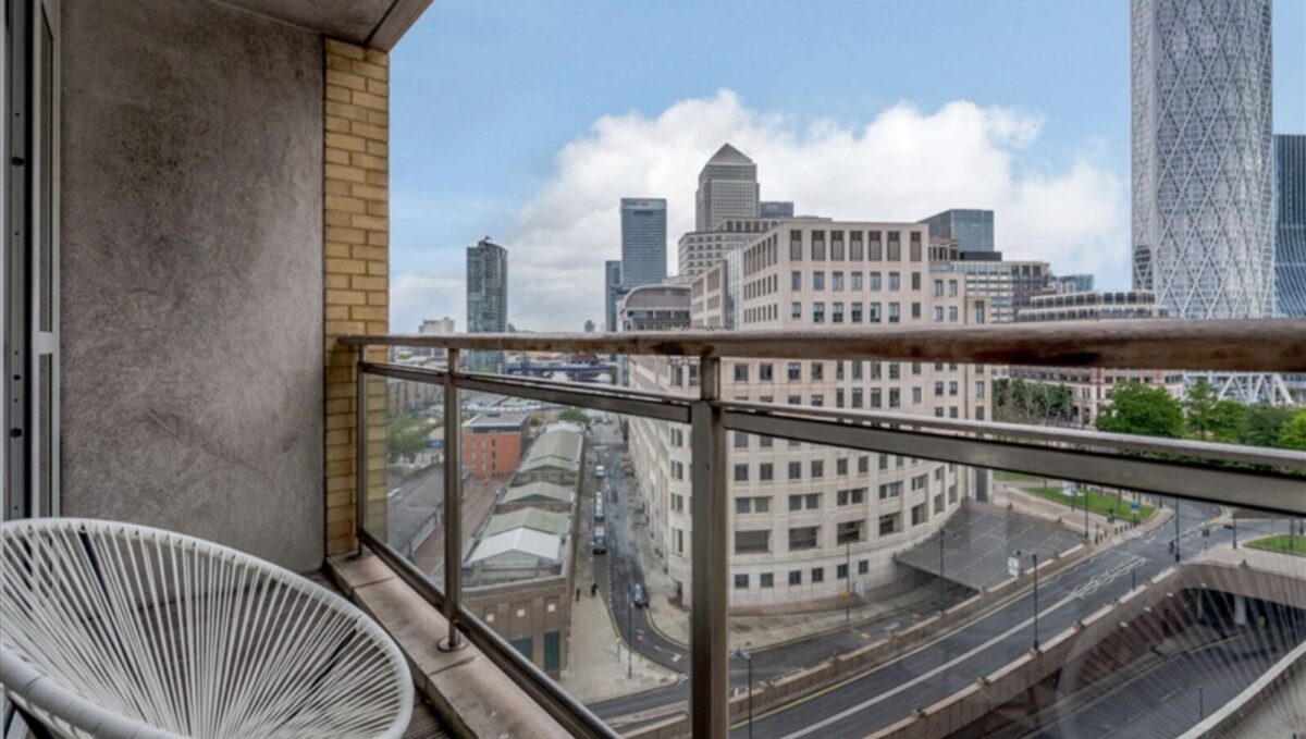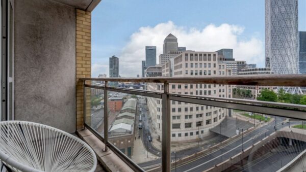 The apartment is filled with natural light thanks to its floor-to-ceiling windows, and the private balcony offers breathtaking views of the impressive Canary Wharf skyline, creating a serene atmosphere.