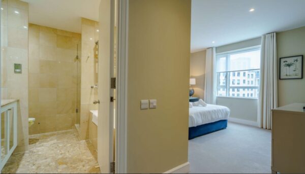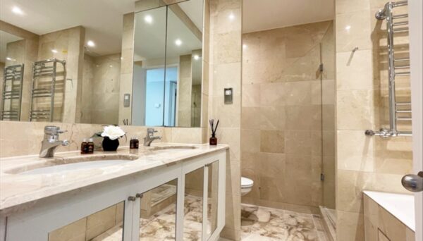 The primary bedroom features a marble en-suite bathroom, and there is an additional family bathroom in the apartment.