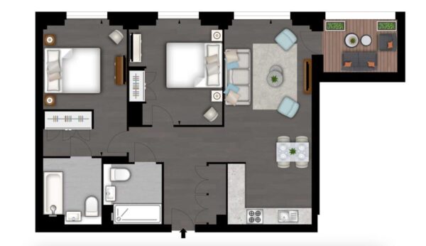 The apartment comprises two double bedrooms and two bathrooms, one of which is an en-suite bathroom connected to the master bedroom. Ample storage space is also available.