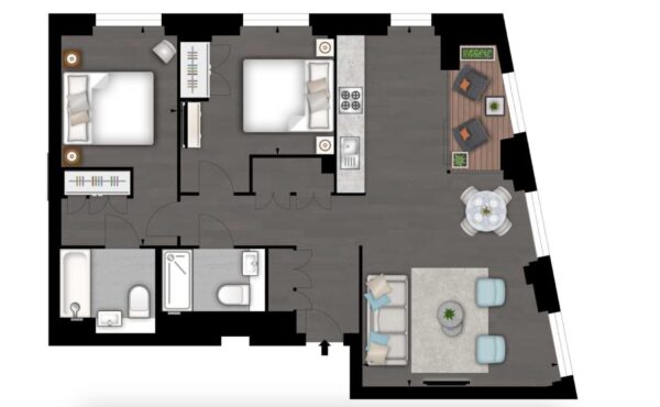 With two double bedrooms and two bathrooms, including an en-suite bathroom in the master bedroom, this apartment offers ample space and comfort. There is also a private balcony accessible from both the reception area and one of the bedrooms. Storage space is plentiful throughout the apartment.