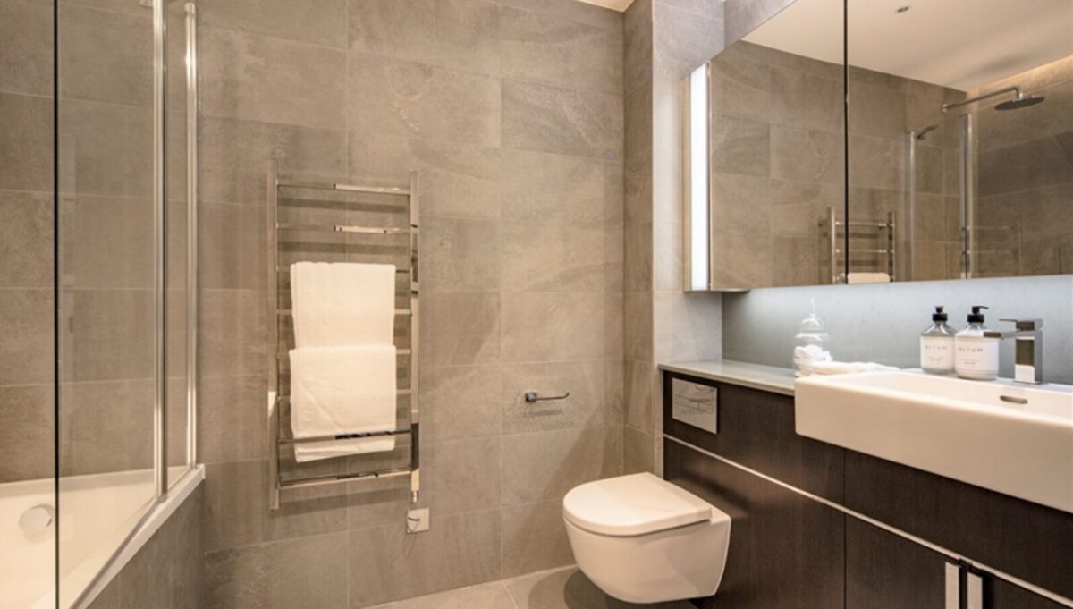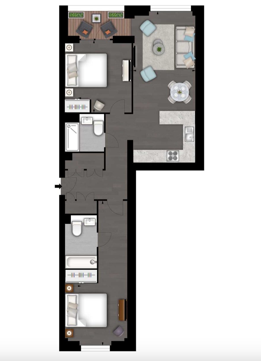 The apartment offers two generously sized double bedrooms, each with its own en-suite bathroom. The master bedroom features an exquisite en-suite bathroom, while both bedrooms provide access to a private balcony that can also be reached from the reception area. Additionally, the apartment provides ample storage space, ensuring a clutter-free living environment.