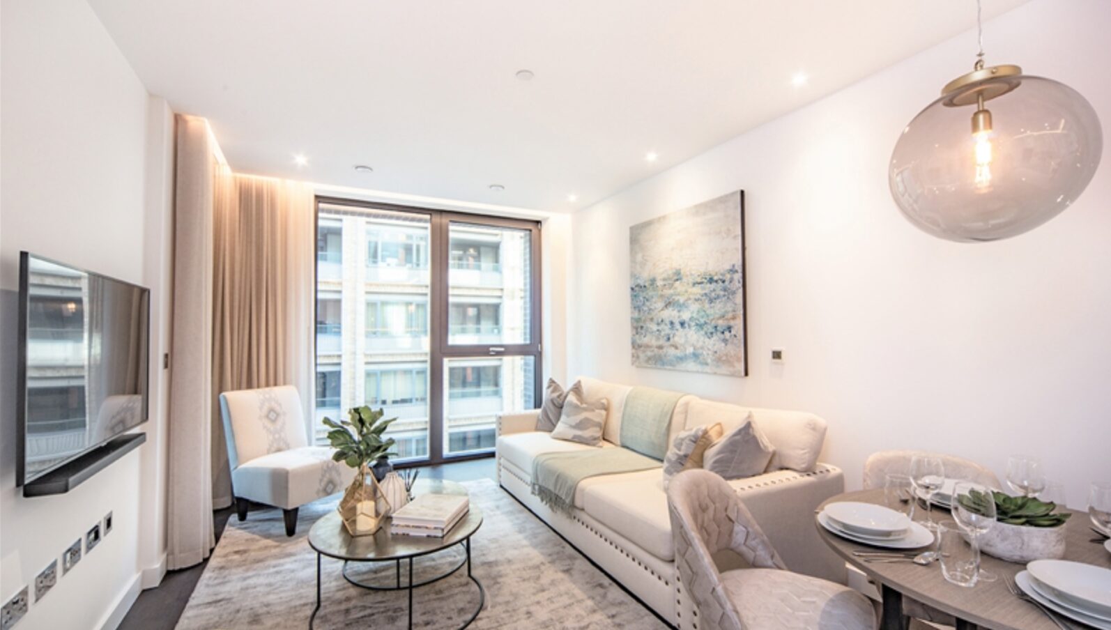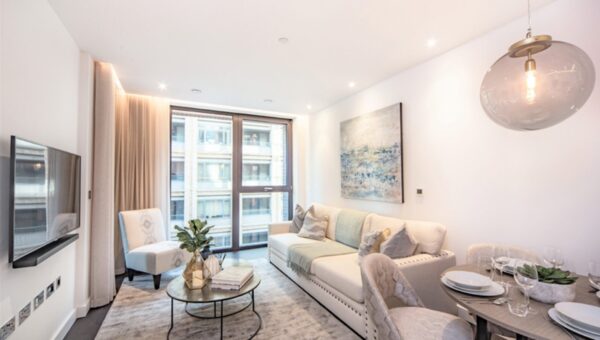 This stunning two-bedroom, two-bathroom apartment spans across 864 square feet and boasts an impressive interior design. Situated in Thornes House, part of The Residence Collection in Nine Elms on London's renowned South Bank, this luxurious apartment offers a truly exceptional living experience.