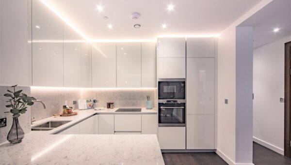 Upon entering the apartment, you are greeted by a spacious reception area that is tastefully furnished and equipped with Samsung Smart TVs and Bose sound bars. These entertainment systems are seamlessly integrated with a built-in Amazon Alexa, allowing residents to effortlessly control the apartment's lighting, TV, and heating systems. The reception room seamlessly flows into an open-plan, fully fitted kitchen that showcases top-of-the-line AEG appliances. Floor-to-ceiling windows flood the space with natural light, creating a bright and airy atmosphere.